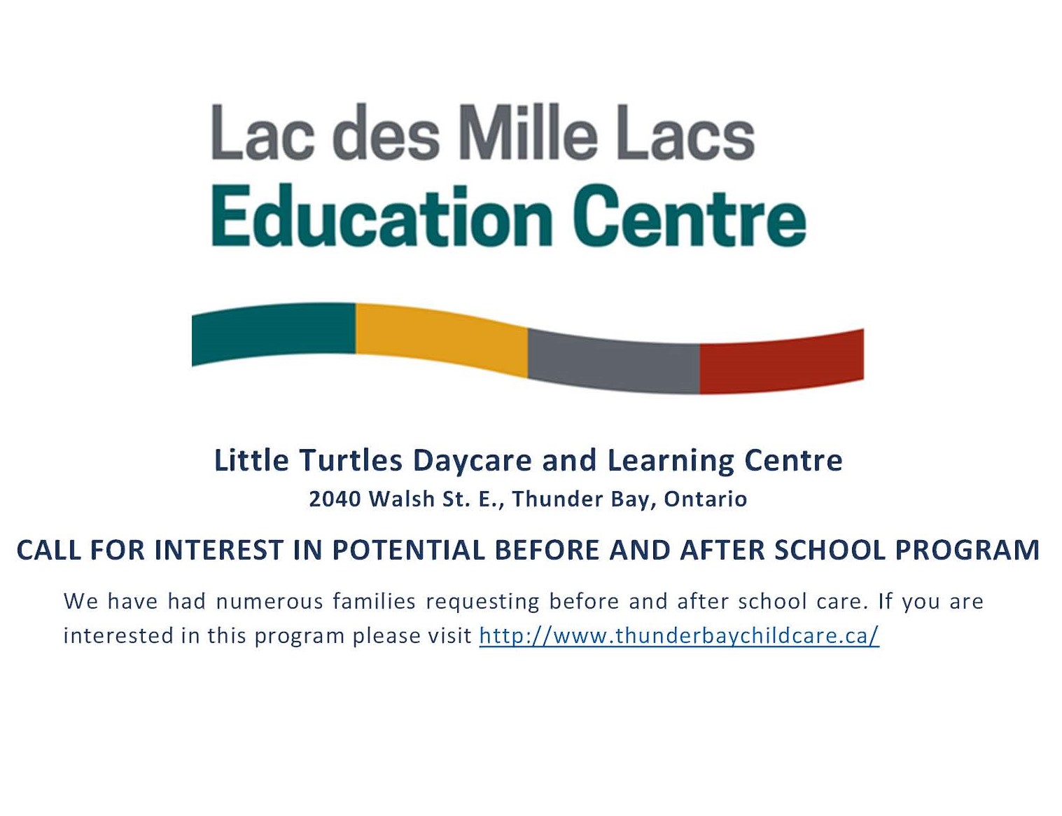 We have had numerous families requesting before and after school care. If you are interested in this program please visit http://www.thunderbaychildcare.ca/