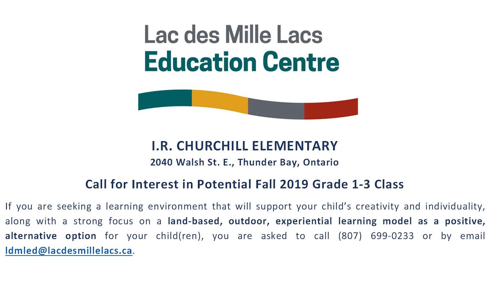If you are seeking a learning environment that will support your child’s creativity and individuality, along with a strong focus on a land-based, outdoor, experiential learning model as a positive, alternative option for your child(ren), you are asked to call (807) 699-0233 or by email ldmled@lacdesmillelacs.ca.