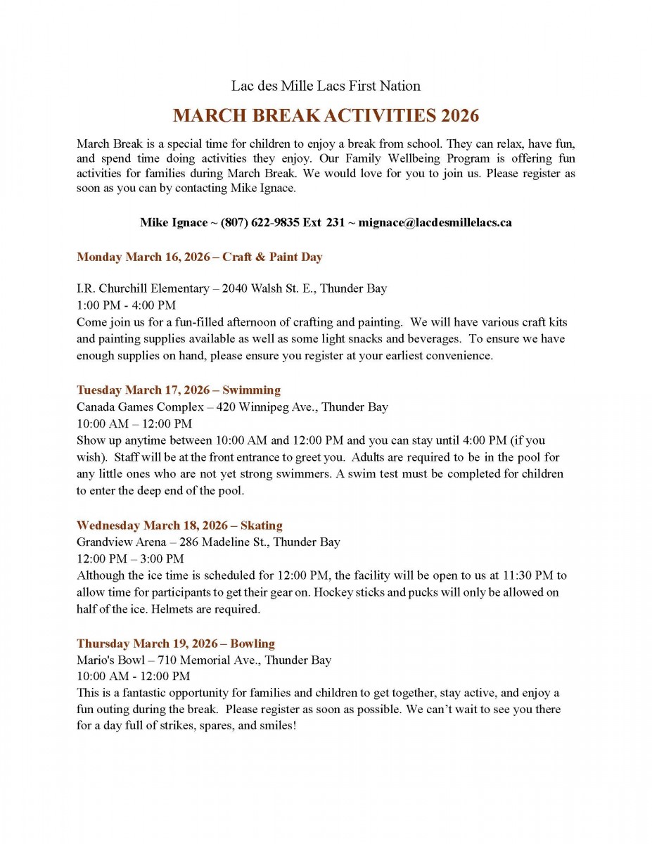 We consider anyone participating in the LAC DES MILLE LACS FIRST NATION Website to be implicitly agreeing to abide by the above terms and conditions. Should you have any questions in relation to the LAC DES MILLE LACS FIRST NATION Website, please send us a message or use the "Contact Us" form by clicking here.